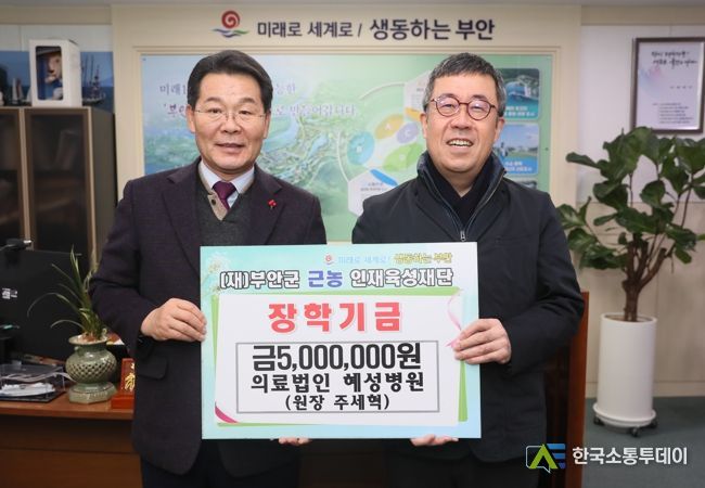 한국소통투데이 관리자 기자 | 의료법인 혜성병원이 지난 26일 부안군 근농인재육성재단을 방문하여 부안군 인재육성 장학금 500만원을 기탁했다.
