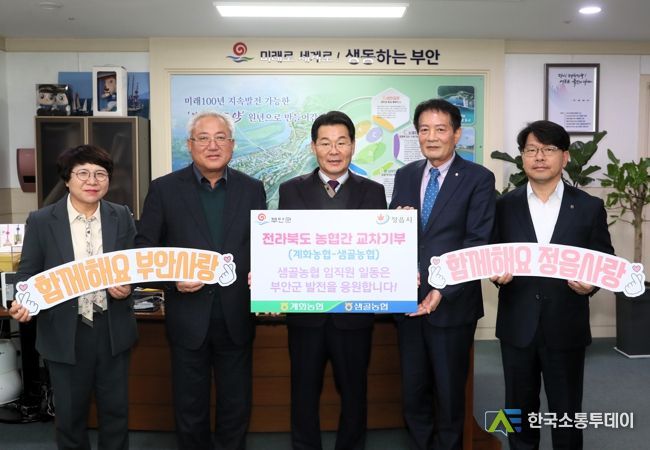 제호]부안군은 지난 26일 부안군 계화농협과 정읍샘골농협 임직원들이 부안군과 정읍시에 건전한 기부문화 조성과 상호 상생발전을 위해 상호기부를 실시했다고 전했다.