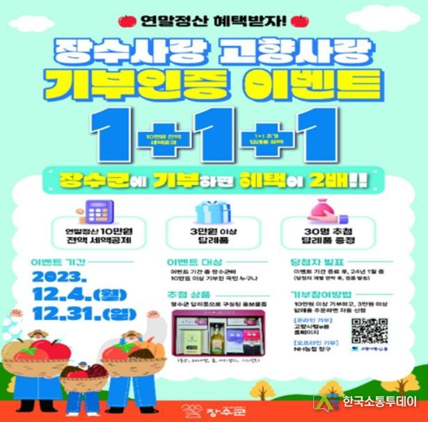 한편 장수군은 연말을 맞아 12월 4일부터 31일까지 10만원 이상 장수군에 기부하는 국민에게 추첨을 통해 장수군 답례품으로 구성된 홍보 물품 종합세트(사과정과, 식초, 도라지청, 홍삼정 스틱, 꿀 스틱 등)를 지급하는 ‘장수사랑 고향사랑 기부인증 이벤트 1+1+1’을 진행하고 있다.
