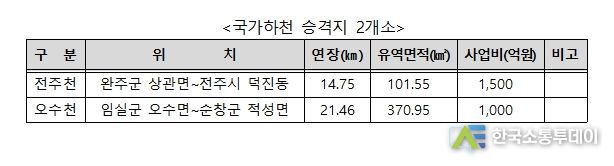 환경부는 ‘홍수방어 기반시설의 획기적 확대’ 대책의 일환으로 지방하천의 국가하천 승격 대상지 20개소를 발표했으며, 도내 전주천, 오수천이 국가하천으로 승격돼 국가재정을 통한 신속한 정비가 가능해졌다.