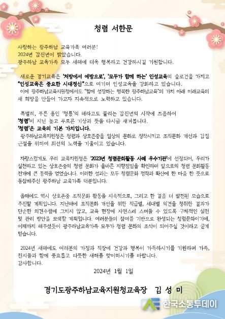 한국소통투데이 관리자 기자 | 경기도광주하남교육지원청이 새해를 맞아 교육장 청렴서한문을 배포했다.