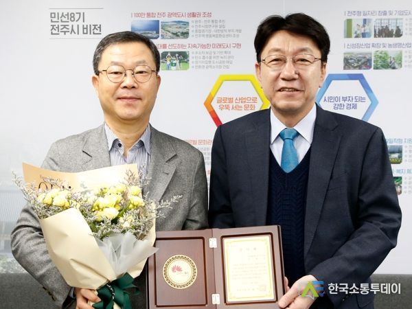 한국소통투데이 관리자 기자 | 우범기 전주시장은 29일 프로축구 발전과 전주시민 화합을 위해 힘써온 허병길 전북현대모터스FC 대표이사에게 감사패를 수여했다.