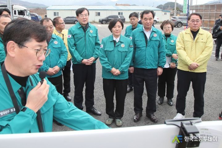 먼저 거점 소독시설을 점검한 송 장관은 가축전염병의 전파가 주로 사람과 차량을 통해 축사 내로 전파되므로 거점소독시설의 역할이 굉장히 중요하다고 강조하며 방문하는 모든 차량에 대해 빈틈없이 꼼꼼한 소독을 당부했다.