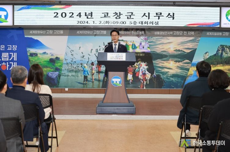 이어 “2024 새해는 더 큰 도약, 더 좋은 고창‘을 이뤄내겠다”고 강조했다. 민선8기 성공궤도에 올려놓기 위한 3대 중점사업으로 ▲5대 전략사업(신활력산업단지 준공 및 삼성전자 입주, 터미널 도시재생 혁신지구 국가시범사업, 고창(호남권) 드론통합지원센터, 고창종합테마파크, 농촌협약·농촌관광 스타마을) 본격화 ▲세계유산도시 관광명소화 ▲군민들의 실질적인 소득·생활여건 개선을 선정했다.