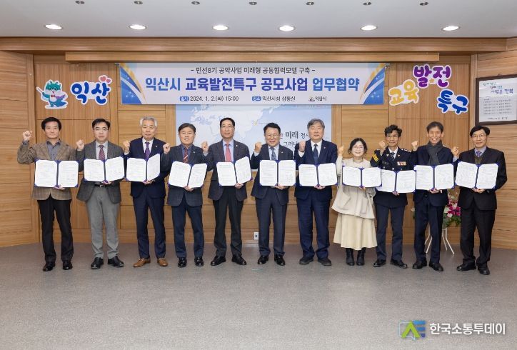 시는 지난 2일 시청 상황실에서 익산시의회, 익산교육지원청, 익산경찰서, 한국식품산업클러스터진흥원, 익산상공회의소, 원광대학교, 원광보건대학교, 원광디지털대학교, 전북대학교특성화캠퍼스, 한국폴리텍대학 익산캠퍼스 등 12개 기관이 참여한 가운데 교육발전특구 거버넌스 구축을 위한 협약식을 체결했다.