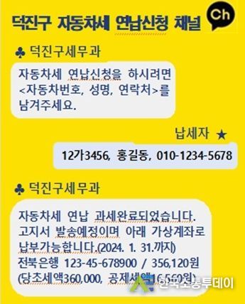 한국소통투데이 관리자 기자 | 전주시 덕진구는 자동차세 연납신청이 집중되는 1월부터 연납신청 접수를 위한 카카오톡 채널을 운영한다고 밝혔다.