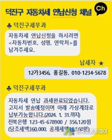 한국소통투데이 관리자 기자 | 전주시 덕진구는 자동차세 연납신청이 집중되는 1월부터 연납신청 접수를 위한 카카오톡 채널을 운영한다고 밝혔다.