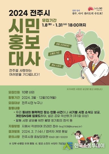 시는 오는 31일까지 현지인으로서 본인이 사는 동네의 이야기를 발굴해 글·사진·그림·만화로 표현하고, 이를 개인 SNS에 게재하는 등 전주시를 알리는 홍보활동에 참여할 ‘2024 전주시 시민홍보대사’를 공개 모집한다.