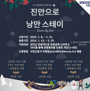 한편, 겨울 진안 낭만 스테이(알뜰관광 1차) 사업에 대한 세부적인 내용은 군청 홈페이지 공고문을 참조하거나 관광과로 문의하면 된다.