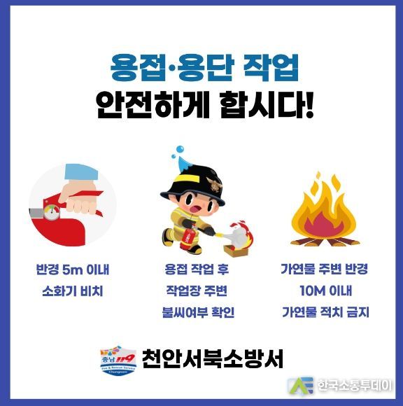 이에 천안서북소방서는 공사장 화재 예방을 위한 안전 수칙으로 ▲ 용접 등 화기 취급 작업 시 화재 감시자 지정 배치 ▲ 용접 시 작업자로부터 반경 5m 이내 소화기 비치 ▲ 작업장 주변 반경 10m 이내 가연물 적치 금지 ▲ 가연물 주변에서 흡연 금지 ▲ 용접 작업 후 작업장 주변 불씨 여부 확인 등을 강조했다.