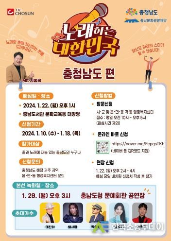 한국소통투데이 관리자 기자 | 충남도는 오는 18일까지 TV조선 주관 ‘노래하는 대한민국’ 참가 신청을 받는다고 15일 밝혔다.