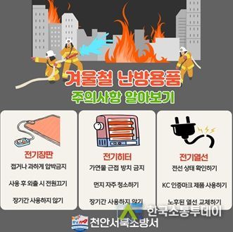 한국소통투데이 관리자 기자 | 천안서북소방서는 추워진 날씨에 난방용품 사용량이 증가하면서 겨울철 3대 난방용품 사용에 각별한 주의가 필요하다고 전했다.