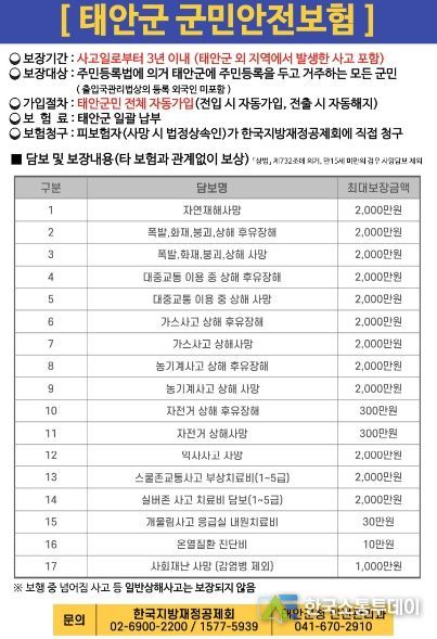 태안군에 주민등록을 두고 거주하고 있는 군민은 별도의 보험가입 절차나 조건 및 가입비 없이 자동으로 가입돼 보험 수익자가 되며, 보험기간은 사고 발생일로부터 3년이다.