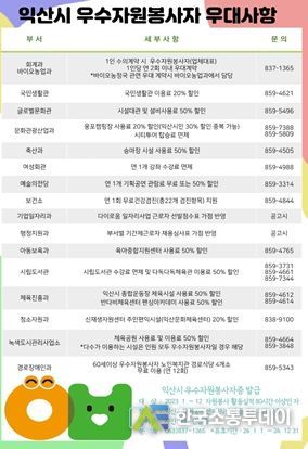 한편 익산시 자원봉사자는 2023년 12월 기준 10만 6,000여 명이 등록돼 활동하고 있다.