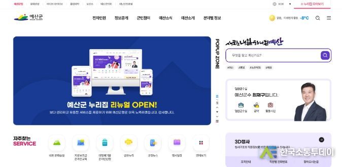 한국소통투데이 관리자 기자 | 예산군은 최신 웹 기술 및 디자인을 반영한 맞춤형 대표 누리집(홈페이지)을 전면 개편해 19일부터 새로운 누리집 서비스를 본격 시작한다.
