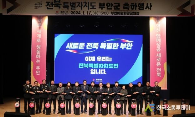 한국소통투데이 관리자 기자 | 부안군은 전북특별자치도 출범을 하루 앞둔 지난 17일 부안예술회관에서 열린 전북특별자치도 출범 축하 행사를 시작으로 새로운 전북, 특별한 부안 만들기에 행정 역량을 집중한다고 밝혔다.