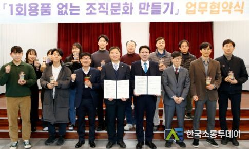전주시와 한국은행 전북본부는 18일 한국은행 전북본부 2층 강당에서 우범기 전주시장과 윤상규 한국은행 전북본부장 등 양 기관 관계자 20여 명이 참석한 가운데 ‘1회용품 없는 조직문화 만들기’ 업무협약을 체결했다.