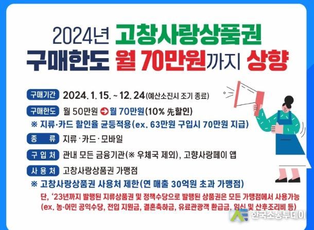 한국소통투데이 관리자 기자 | 고창군이 고창사랑상품권 구매한도를 1인당 월50만원에서 월70만원까지 상향해 연중 10% 상시 할인 판매한다. 설 명절이 있는 2월은 구매한도를 월100만원까지 올려 10% 할인판매한다.