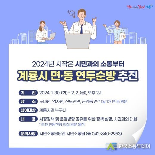 한국소통투데이 관리자 기자 | 계룡시는 갑진년 새해를 맞아 시민의 다양한 목소리를 경청하고 소통을 나누기 위한 면·동 연두순방을 실시한다고 밝혔다.