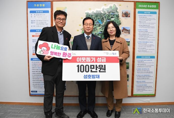 한국소통투데이 관리자 기자 | 완주군 봉동읍에 위치한 성호방재가 완주군에 이웃돕기 성금 100만 원을 기탁했다.