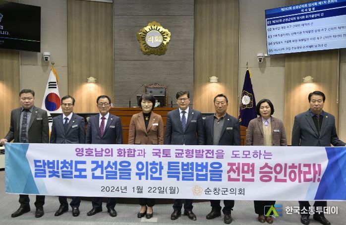 순창군의회는 ▲기획재정부가 달빛철도 건설을 위한 특별법의 전면 승인 ▲국회의 달빛철도사업 추진의 즉각적인 실행 ▲국가 차원의 전폭적인 지원을 해야 한다는 내용이 담긴 건의문을 정부와 국회의장 및 전국 시군구에 송부했다.