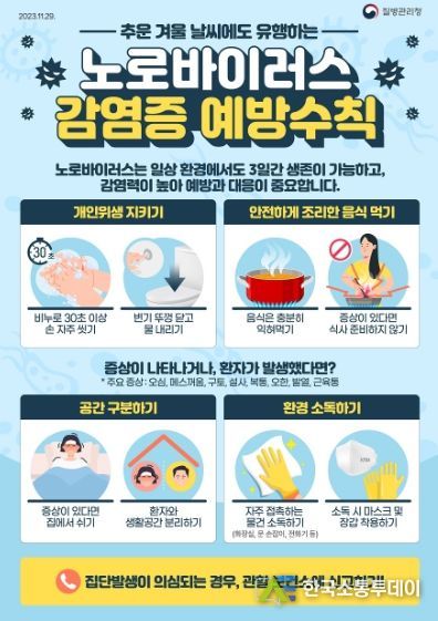 서산시 보건소는 추운 겨울에도 유행하는 노로바이러스 등을 예방하기 위해 ▲비누로 30초 이상 손 씻기 ▲안전하게 조리한 음식 먹기 ▲감염 증상 발생 시 공간 분리 및 주변 소독을 당부했다.