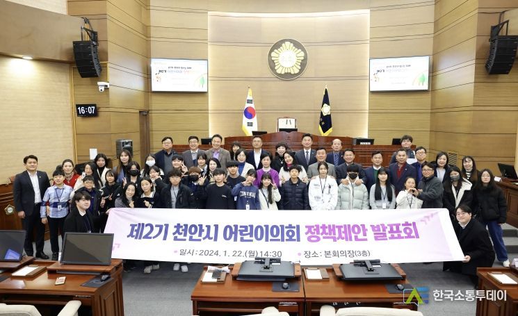한국소통투데이 관리자 기자 | 2024년 1월 22일 천안시의회 본회의장에서 천안시의회 정도희 의장을 비롯한 의원들과 26명의 제2기 어린이의회 의원들이 모여 천안시 발전을 위한 정책제안 발표회를 가졌다.