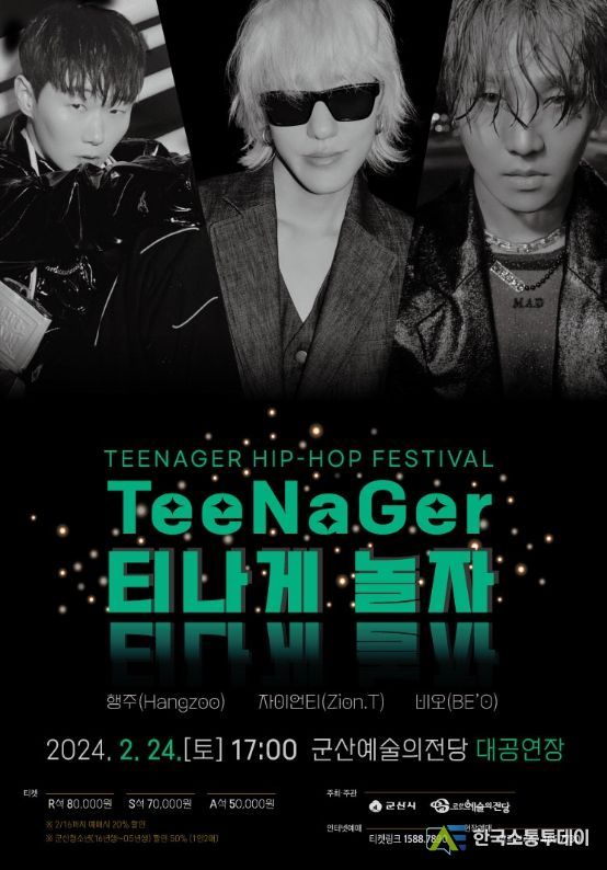 Teenager HIP-HOP Festival 티나게'TeeNaGer'놀자!는 R석 80,000원 S석 70,000원 A석 50,000원으로 오는 2월 25일 오전 11시부터 티켓링크에서 예매 가능하며 기타 자세한 사항은 군산예술의전당 홈페이지를 통해 확인 가능하다.