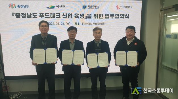 도는 24일 예산군 더본외식산업개발원에서 유재룡 도 산업경제실장과 도중선 예산군 부군수, 박윤제 공주대 식품공학과 교수, 변준호 ㈜더본코리아 본부장 등 10명이 참석한 가운데, ‘푸드테크 산업육성 및 푸드테크 연구지원센터 유치’를 위한 다자간 업무협약을 체결했다고 밝혔다.