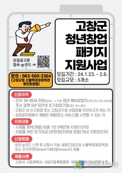 사업 희망자는 1월 23일부터 2월 6일까지 방문 또는 전자우편으로 신청할 수 있으며, 자세한 사항은 고창군청 홈페이지 고시·공고에서 확인할 수 있다.