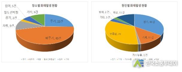 화재통계에 의하면 화재 발생 장소별 현황은 비주거 40건(46%)'주거 22건(25.4%)'차량 9건(10.3%)'기타 9건(10.3%)'임야 5건(5.7%)순으로 나타났으며 원인별 현황은 전기 30건(34.5%)'부주의 29건(33.3%)'기타 15건(17.3%)'기계 11건(12.6%)'방화 2건(2.3%)순으로 나타났다.