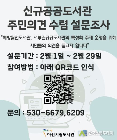 설문조사는 2월 1일부터 29일까지 온라인으로 진행되며, 아산시민 누구나 참여할 수 있다. 설문은 신규 개관 예정인 배방월천도서관 및 서부권 공공도서관(가칭)의 특화주제 선정에 대해 실시하며, 선정된 결과를 도서관 공간구성 및 운영 방향 등에 적극적으로 반영할 계획이다.