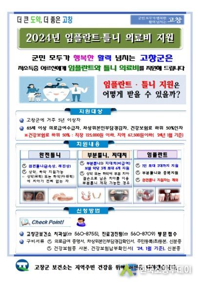 올해도 고창군은 ‘저소득층 임플란트·틀니 본인부담금 지원사업’을 중점 추진한다. 올해 저소득층 노인 임플란트·틀니 의료비(본인부담금) 지원내용으로 ▲(노인틀니) 완전 및 부분틀니(레진상, 금속상) 급여 적용 후 본인부담금 ▲(임플란트) 상·하악 구분없이 1인 최대 2대 지원(치아가 전혀 없는 경우 제외하고 부분틀니와 중복지원 가능) ▲(지대치 보철) 부분틀니 1악당 최대 3개(2악 최대 6개)까지 보철 비용 지원(비급여) ▲(틀니 사후관리) 틀니 시술 후 5년 이내 사후 관리비 지원 등이다.