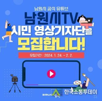 한국소통투데이 관리자 기자 | 남원시는 시민의 관점으로 본 시정 현장과 지역의 각종 문화, 관광, 시정 소식을 취재하고자 ‘2024년 상반기 유튜브 시민 영상기자단’을 오는 2월 2일까지 모집한다고 밝혔다.