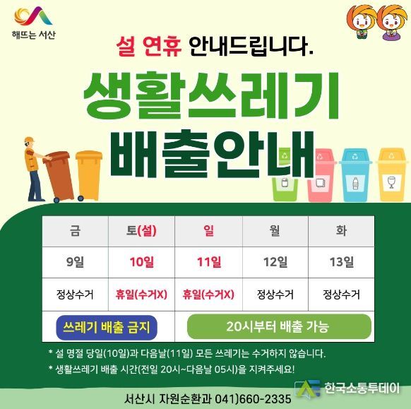 한국소통투데이 관리자 기자 | 충남 서산시가 설 명절 기간 중 서산시민의 쾌적한 주거환경을 위해‘설 명절 쓰레기 관리대책’을 29일부터 2월 18일까지 시행한다.