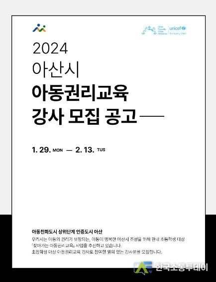 한국소통투데이 관리자 기자 | 유니세프 아동친화도시 아산시가 초등학생을 대상으로 실시하는 ‘찾아가는 아동권리교육’을 위하여 전문강사를 공개모집한다.