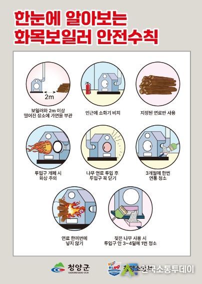 인쇄물에 담긴 안전 수칙은 ▲보일러와 2m 이상 떨어진 장소에 가연물 보관 ▲인근에 소화기 비치 ▲지정된 연료만 사용 ▲투입구 개폐 시 화상 주의 ▲나무 연료 투입 후 투입구 꼭 닫기 ▲3개월에 1회 연통 청소 ▲연료 한꺼번에 넣지 않기 ▲젖은 나무 사용 시 3~4일에 1회 투입구 안 청소 등이다.