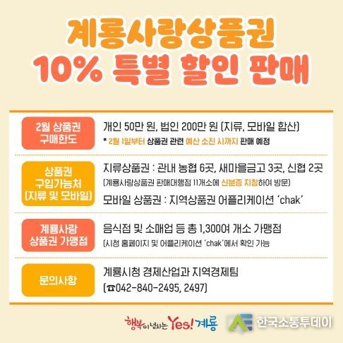 한국소통투데이 관리자 기자 | 계룡시가 2월 한 달간 지역상품권인 ‘계룡사랑상품권’ 10% 특별할인에 나선다고 밝혔다.
