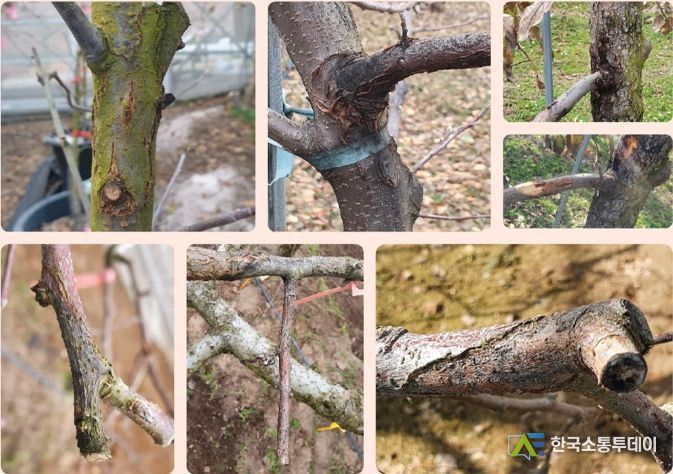 겨울철 사과·배 과원에서 관찰할 수 있는 궤양 증상으로는 △수피가 갈라지거나 터지는 형태 △진갈색이나 검게 변하고 마르는 형태 △수피가 들어가면서 경계가 생기는 형태 등이 있다.