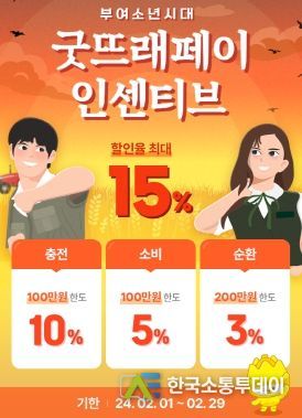 한국소통투데이 관리자 기자 | 부여군은 설을 맞아 전국 유일의 공동체 순환 지역화폐인 굿뜨래페이의 인센티브에 대해 2월 한 달 동안 기존 10% 에서 5% 인상한 15% 인센티브 정책을 시행한다.