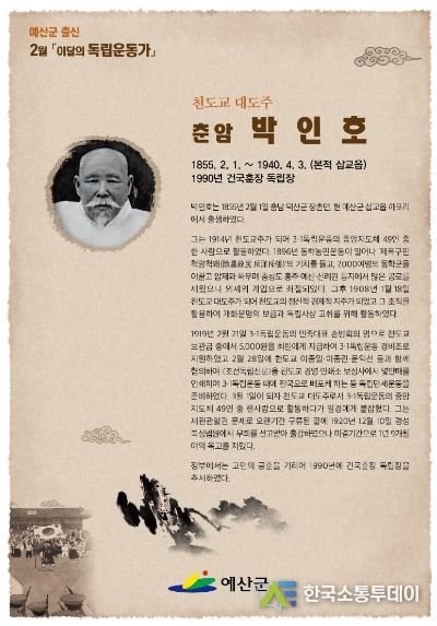 한국소통투데이 관리자 기자 | 예산군은 나라의 독립을 위해 희생한 독립운동가를 널리 알리기 위해 추진하는 ‘2월 이달의 독립운동가’로 춘암 박인호 선생을 선정했다고 밝혔다.
