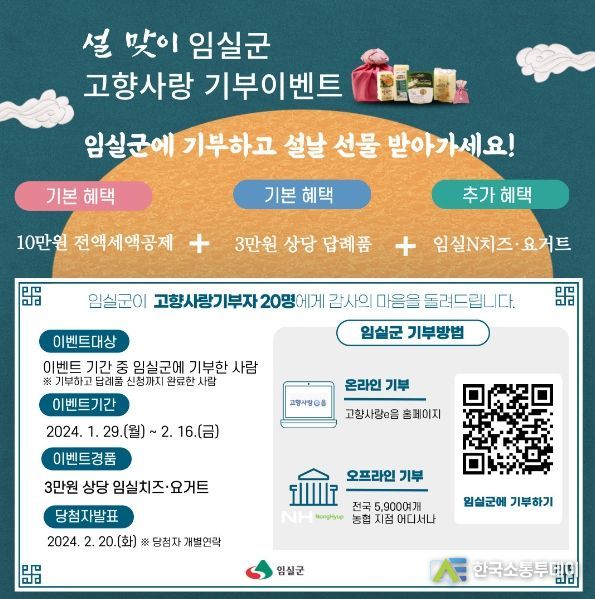 한국소통투데이 관리자 기자 | 전북특별자치도 임실군이 설 명절을 맞아 고향사랑기부 감사이벤트를 전개한다.