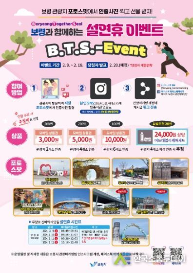 한국소통투데이 관리자 기자 | 보령시는 갑진년 설연휴 보령시를 방문하는 관광객을 대상으로 관광지 SNS 인증“보령과 함께하는 설연휴(B.T.S, Boryeong Together Seol) 이벤트”를 진행한다.
