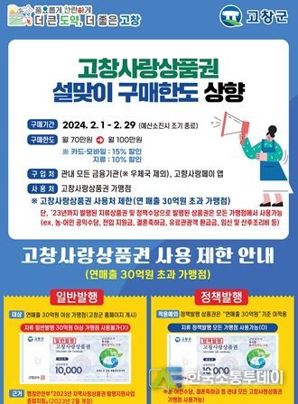 고창군은 설명절을 맞이하여 고창사랑상품권 구매한도를 기존 70만원에서 100만원으로 높인다. 또 카드·모바일형을 15% 할인 판매로 고물가로 위축된 소비심리를 회복하고 지역상권 활력 증진을 도모한다.