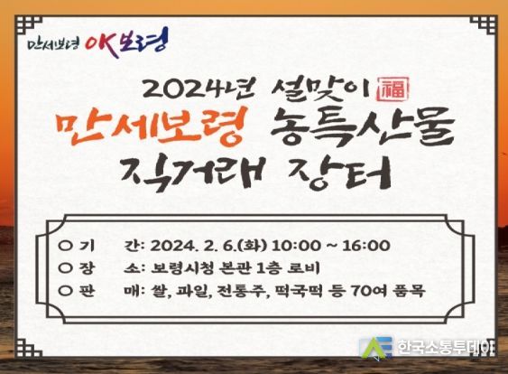 한국소통투데이 관리자 기자 | 보령시는 설 명절을 앞두고 오는 6일 오전 10시부터 오후 4시까지 보령시청 본관 1층 로비에서‘2024년 설맞이 만세보령 농특산물 직거래장터’를 연다고 밝혔다.
