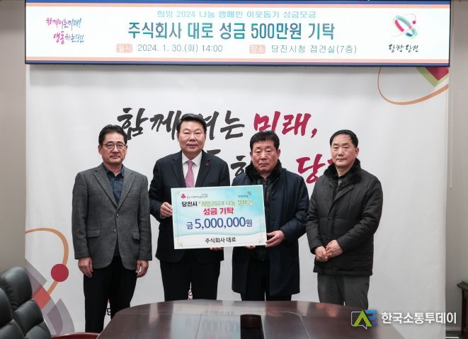 한국소통투데이 관리자 기자 | ㈜대로는 30일 ‘희망 2024 나눔 캠페인’ 성금으로 500만 원을 기탁했다. 이번에 열린 전달식에는 오성환 당진시장, 최영춘 대표이사, 최영학 상무 등이 참석했다.