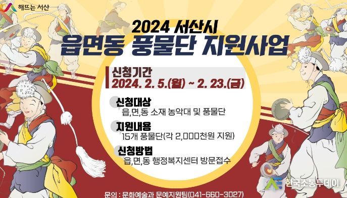 한국소통투데이 관리자 기자 | 충남 서산시가 23일까지 ‘2024년 읍면동 풍물단 강습비 지원사업’으로 우리 고유의 전통예술인 풍물을 계승한다.