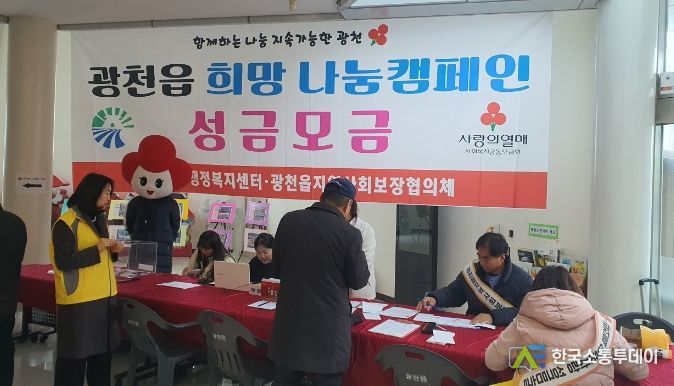 한국소통투데이 관리자 기자 | 광천읍은 지난해 12월 20일 광천문예회관에서 성금모금 캠페인을 실시하는 등 다각적인 홍보활동과 광천읍지역사회보장협의체, 이장협의회, 주민자치회 등과 함께 활발한 독려 활동을 펼친 결과, 희망2024 나눔캠페인 누적성금이 102,721,390원으로 목표액 대비 224.1%를 달성하며 역대 최대 모금액을 달성했다고 5일 밝혔다.