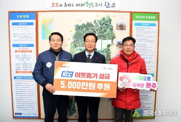 한국소통투데이 관리자 기자 | (주)KCC(대표이사 정재훈)가 완주군에 이웃돕기 성금 5,000만 원을 기탁했다.