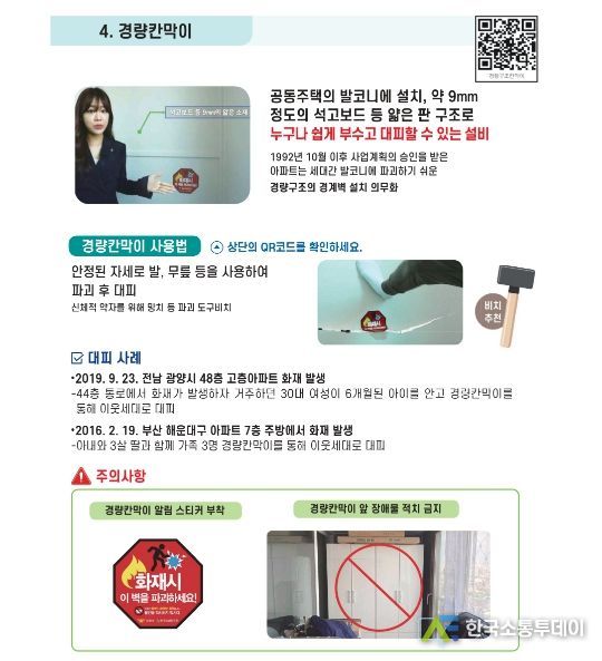 강기원 소방서장은 “개인주택에 비해 공동주택은 벽, 복도, 계단, 엘리베이터 등 건물의 특성상 화재 발생 시 연소 확대가 급격하게 진행된다”라며 “안전을 위해 만들어진 경량칸막이의 사용법을 정확히 숙지해 우리 가족의 안전을 지키기 바란다”라고 전했다.